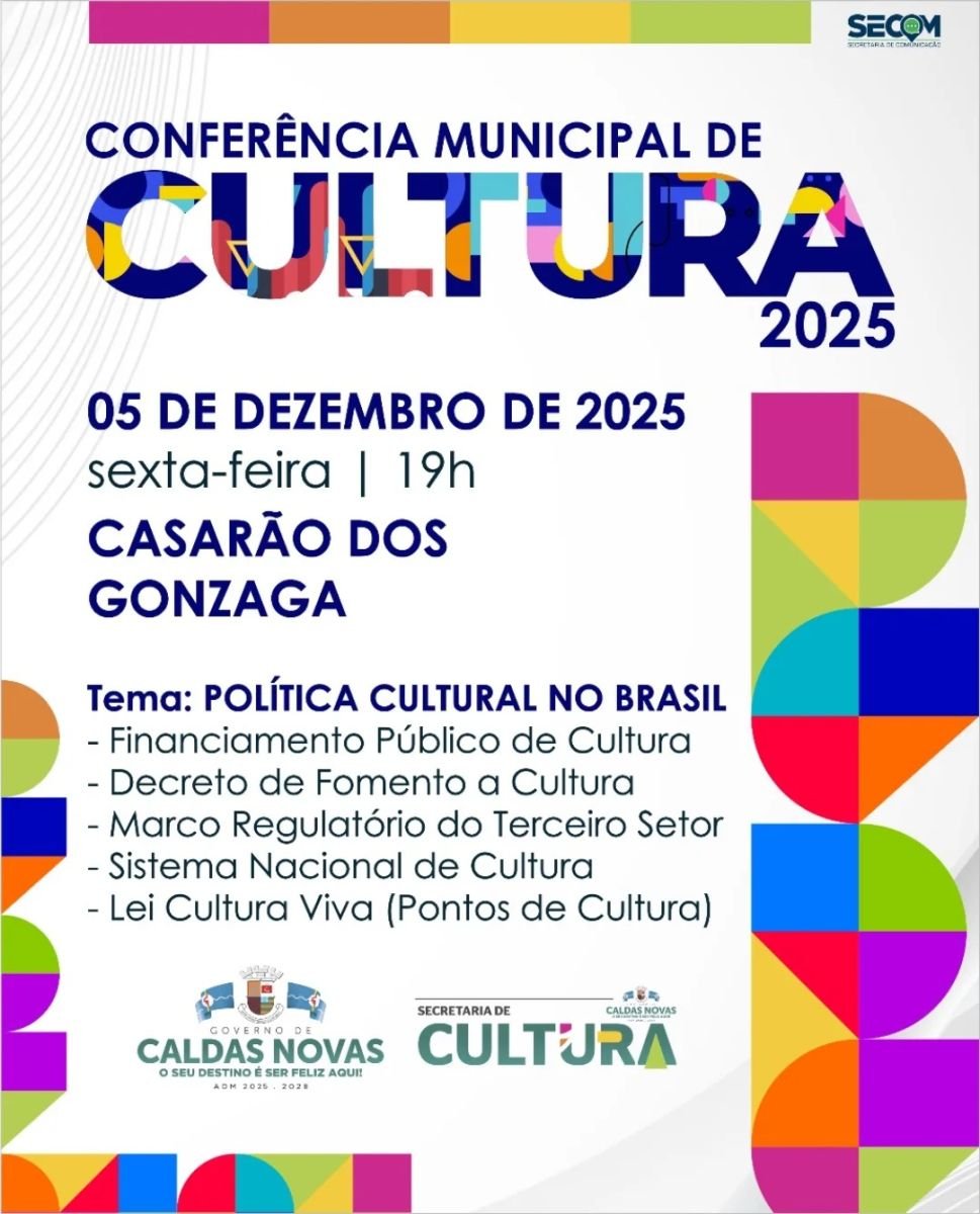 A Prefeitura de Caldas Novas, por meio da Secretaria Municipal de Cultura (SECOM), convoca a população para participar da Conferência Municipal de Cultura 2025, marcada para o dia 5 de dezembro, às 19 horas, no histórico Casarão dos Gonzaga. O encontro promete ser um momento decisivo para os rumos das políticas culturais do município nos próximos anos.