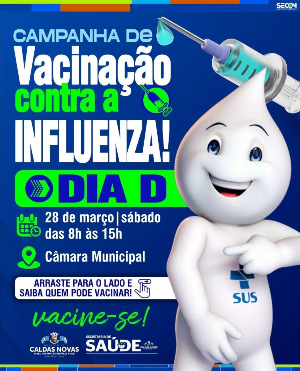A Prefeitura de Caldas Novas, por meio da Secretaria Municipal de Saúde e da Central de Imunização, promove no próximo dia 28 de março de 2026 o "Dia D" da Campanha Nacional de Vacinação contra a Influenza. A ação, que integra o esforço nacional de imunização coordenado pelo Ministério da Saúde, será realizada na Câmara Municipal, das 8h às 15h, com entrada gratuita e sem necessidade de agendamento prévio.