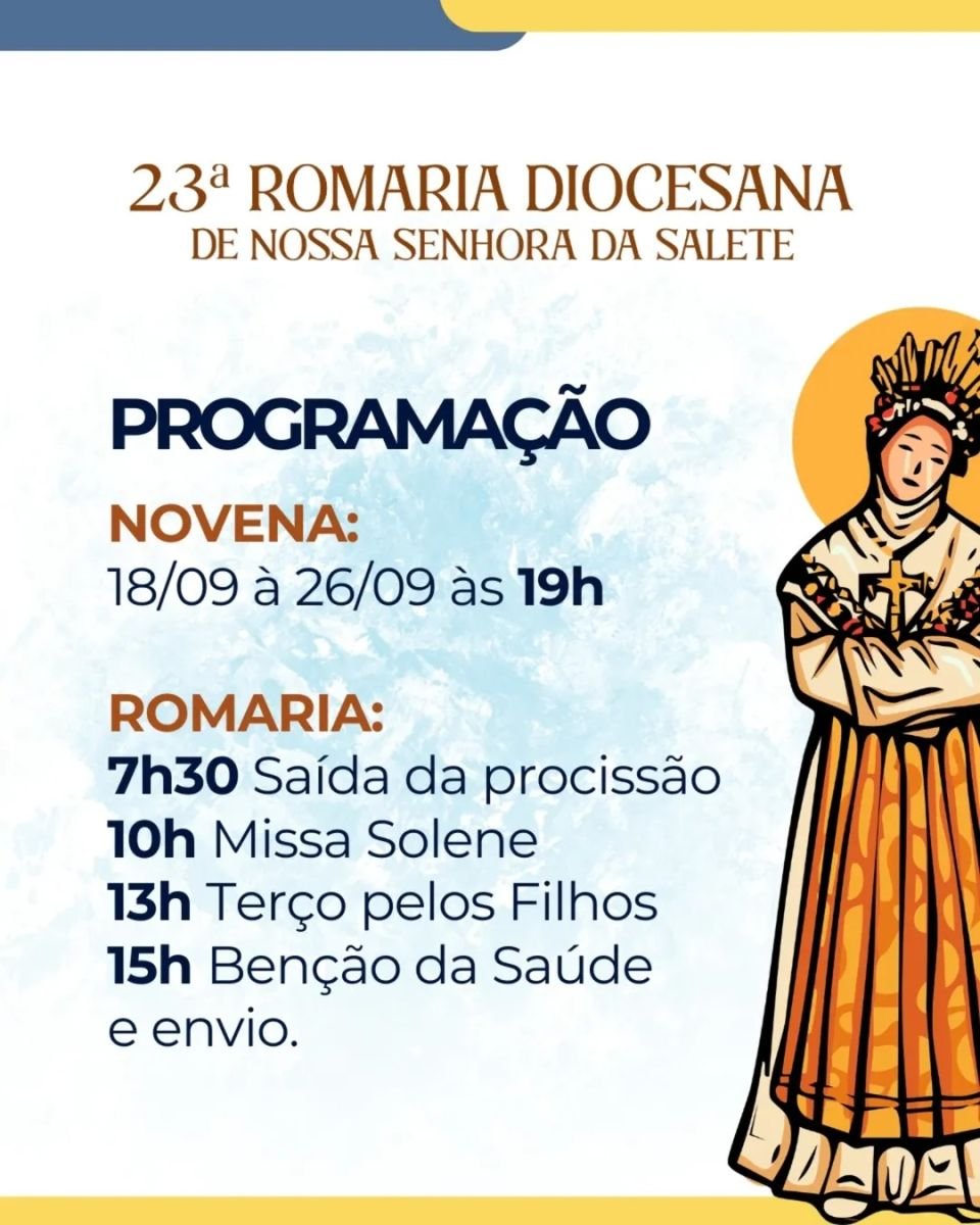 Mas a preparação espiritual começa antes. A novena em honra a Nossa Senhora da Salete acontece entre os dias 18 e 26 de setembro, sempre às 19h, como forma de acolher os fiéis e introduzi-los ao clima de oração e reflexão que antecede o grande evento.