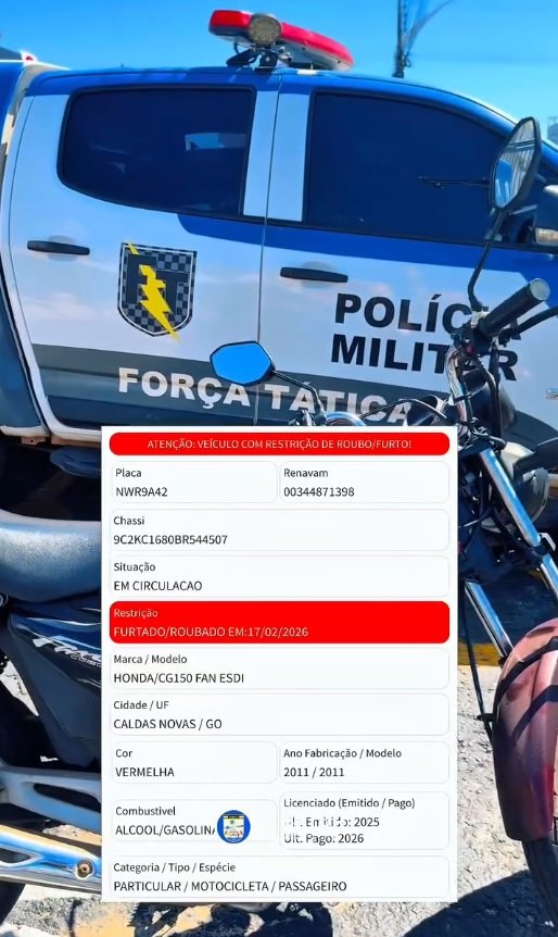 No último dia de Carnaval em Caldas Novas, uma motocicleta vermelha de placa NWR9A42 foi furtada nas proximidades da área de festividades. A ação criminosa, no entanto, teve vida curta diante da atuação rápida e eficiente da Polícia Militar de Goiás.