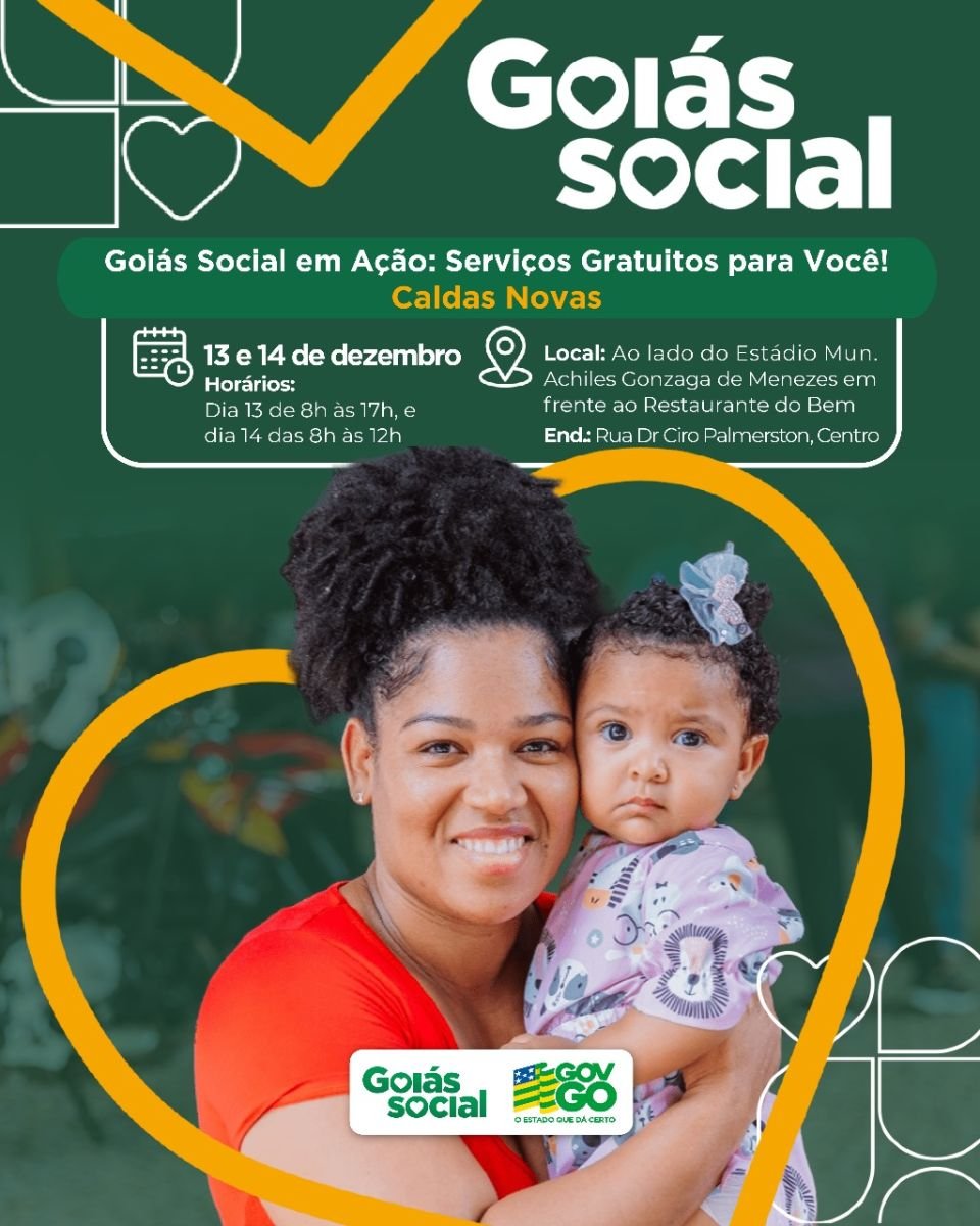 A população de Caldas Novas terá acesso a uma ampla gama de serviços públicos gratuitos nos próximos dias 13 e 14 de dezembro, quando a cidade receberá o programa "Goiás Social em Ação: Serviços Gratuitos para você". A iniciativa, promovida pelo Governo de Goiás em parceria com a Prefeitura de Caldas Novas, concentrará diversos órgãos estaduais e municipais no Espaço Municipal de Eventos, localizado ao lado do Ginásio de Esportes Agostinho Gonzaga de Menezes.