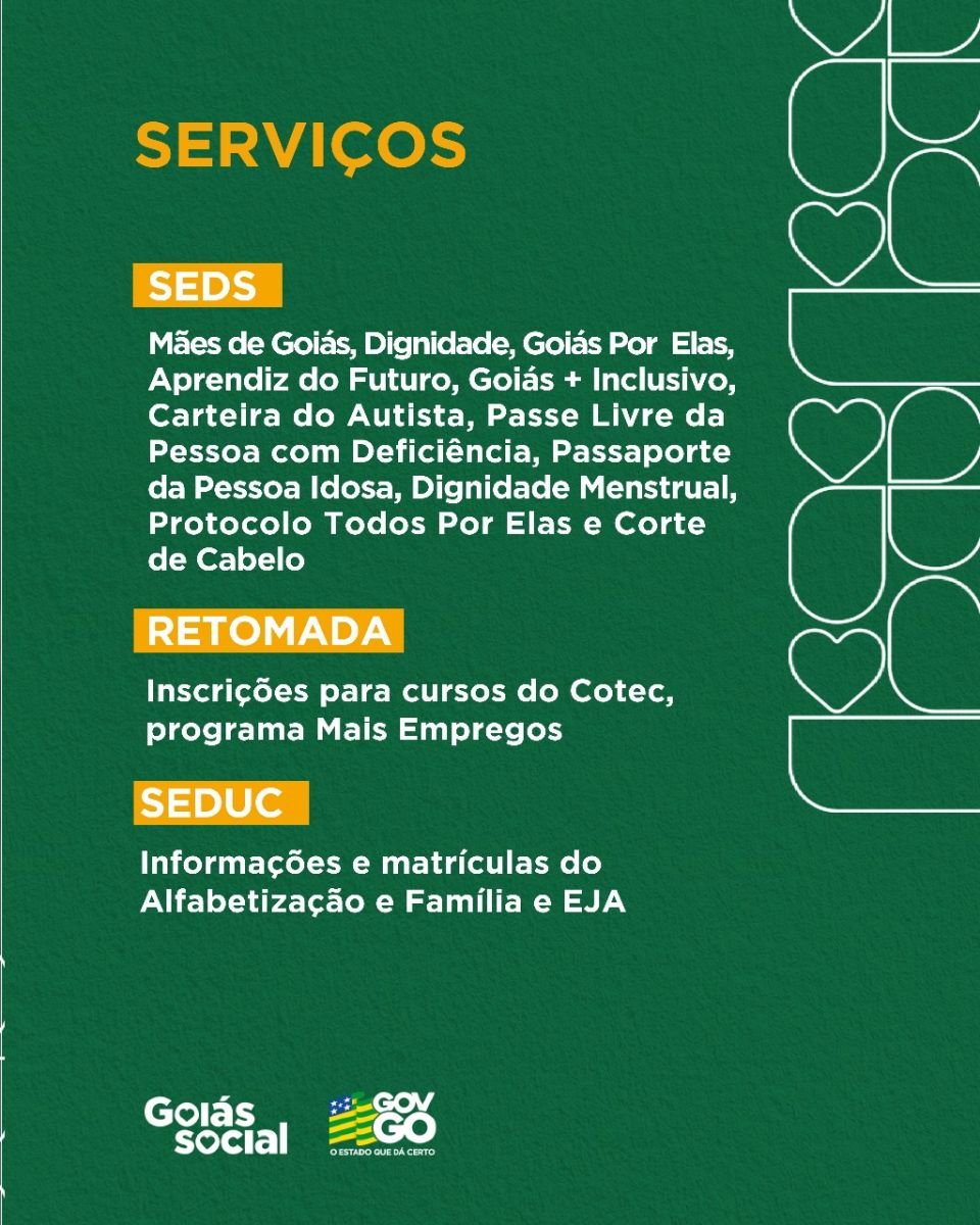 Durante os dois dias de atividades, a comunidade poderá acessar atendimentos de múltiplas secretarias estaduais, incluindo Retomada, Saúde, Educação, Desenvolvimento Social e Agricultura, Pecuária e Abastecimento. Também estarão presentes órgãos como OVG, Vapt-Vupt e Agehab, oferecendo seus serviços sem qualquer custo para os cidadãos.