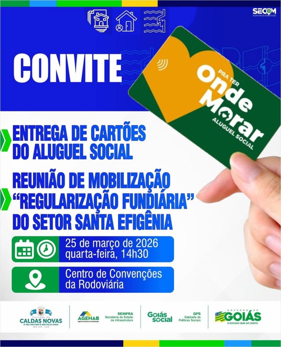 A reunião acontece no Centro de Convenções da Rodoviária de Caldas Novas, a partir das 14h30. O encontro será uma oportunidade para que os moradores tirem dúvidas, recebam orientações detalhadas sobre o processo e dessem o primeiro passo rumo à legalização de seus imóveis.