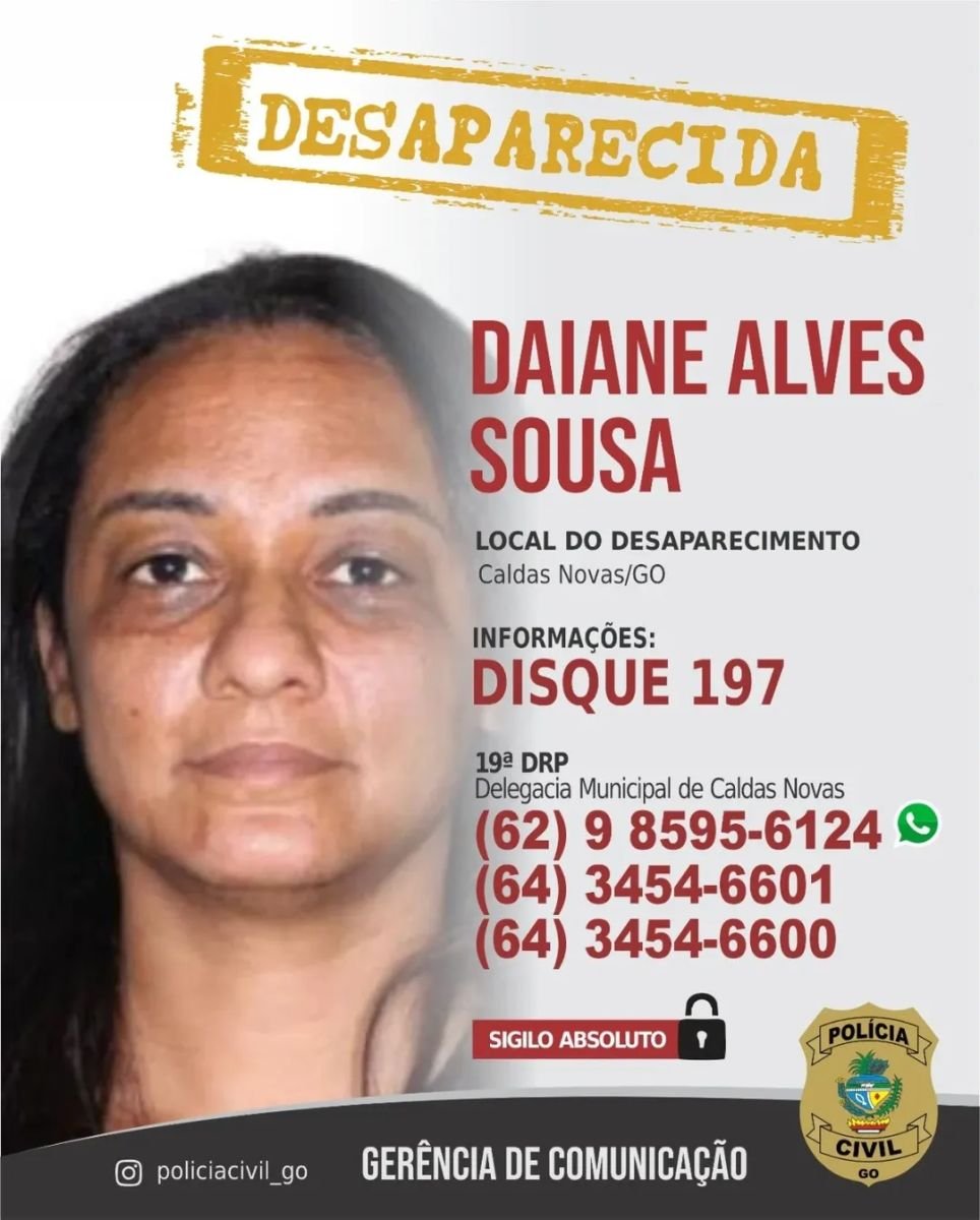 A Polícia Civil solicita a colaboração da população e reforça que qualquer informação sobre o paradeiro de Daiane Alves Sousa pode ser repassada com garantia de sigilo absoluto pelo telefone 197 ou pelos canais oficiais da Delegacia de Polícia de Caldas Novas.