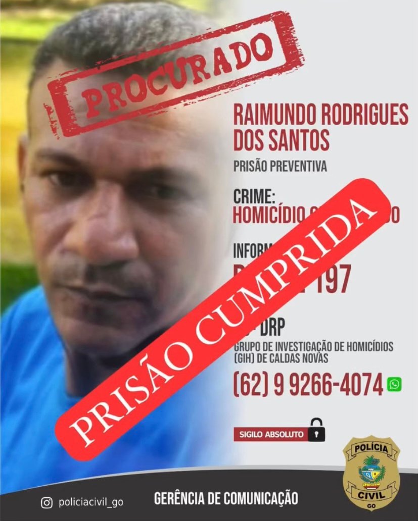 A Polícia Civil de Goiás prendeu hoje Raimundo Rodrigues dos Santos, investigado pelo homicídio qualificado de Antônio Barreto Filho, *em ação integrada do Grupo de Investigação de Homicídios (GIH) de Caldas Novas com o Grupo Especial de Investigações Criminais (GEIC) de Anápolis, vinculado à 3ª DRP* . O mandado de prisão foi cumprido após o compartilhamento de informações e diligências coordenadas entre as unidades, que levaram à localização do investigado em uma chácara no município de Abadiânia.
