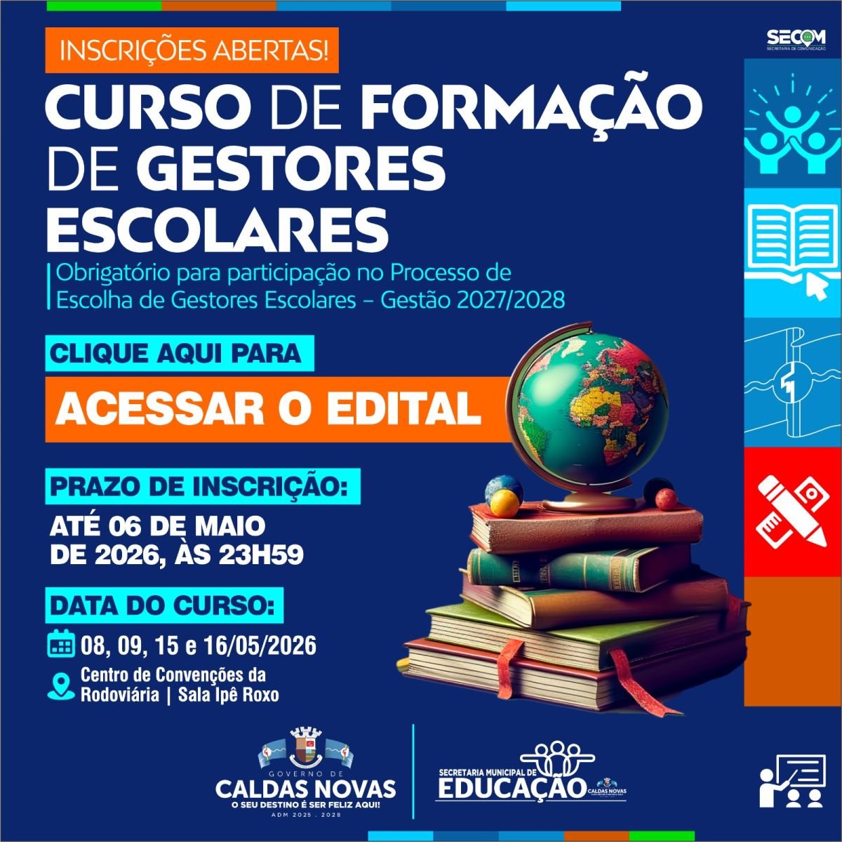 A Prefeitura de Caldas Novas, por meio da Secretaria Municipal de Educação, abriu as inscrições para o Curso de Formação de Gestores Escolares. A participação é etapa obrigatória para quem deseja concorrer ao Processo de Escolha de Gestores Escolares referente à Gestão 2027/2028.