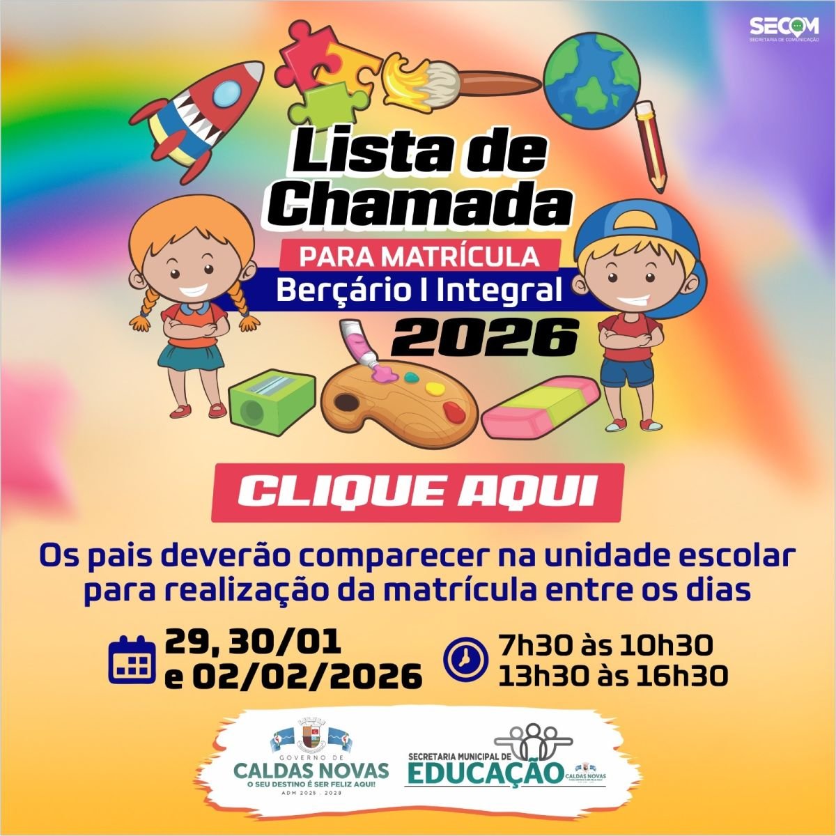 A Secretaria Municipal de Educação de Caldas Novas liberou nesta quarta-feira, 28 de janeiro, a consulta à lista de crianças contempladas com vagas para berçário integral nas creches da rede municipal de ensino. O processo de matrícula já está em andamento e segue até o próximo domingo, dia 2 de fevereiro.