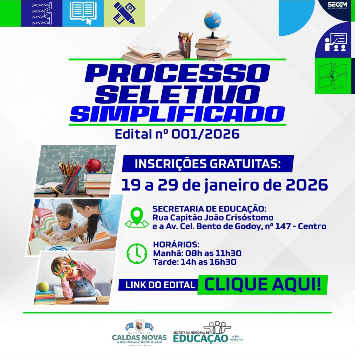 A Prefeitura de Caldas Novas, através da Secretaria Municipal de Educação, deu início nesta segunda-feira, 19 de janeiro, ao processo de recrutamento simplificado que visa preencher vagas temporárias de Profissionais de Apoio à Inclusão nas escolas da rede pública municipal. O documento oficial do Processo Seletivo Simplificado nº 001/2026 foi divulgado no Diário Oficial Municipal em 16 de janeiro.