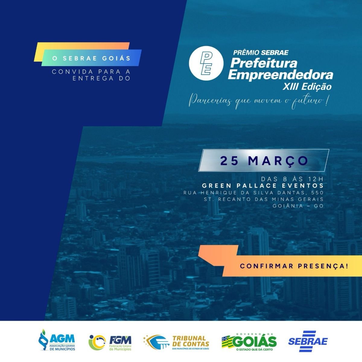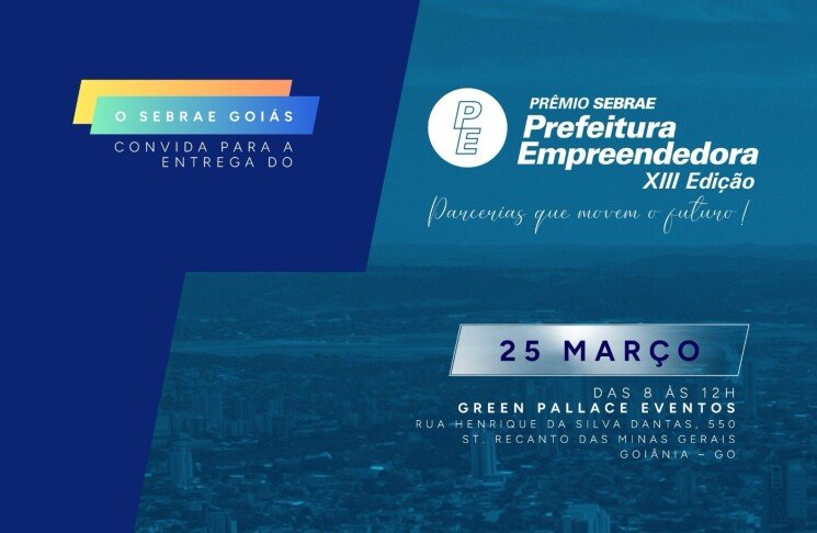 O Sebrae Goiás realizará, no próximo dia 25 de março, às 8h, em Goiânia, a solenidade da etapa estadual do Prêmio Sebrae Prefeitura Empreendedora. O evento será realizado no Green Pallace Eventos e reunirá prefeitos, secretários municipais, autoridades estaduais, vereadores e representantes de instituições parceiras.