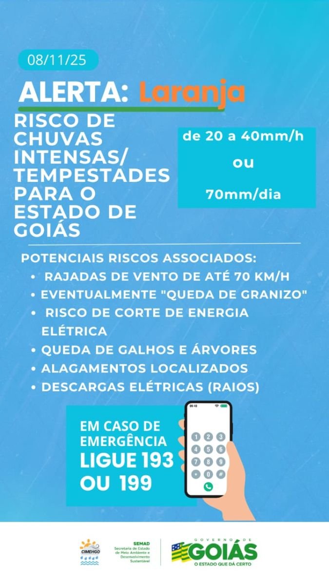 Alerta laranja aceso em Goiás. A previsão indica risco de temporais intensos, ventos que podem chegar a 60 km/hora e possibilidade de granizo, neste sábado (08/11).