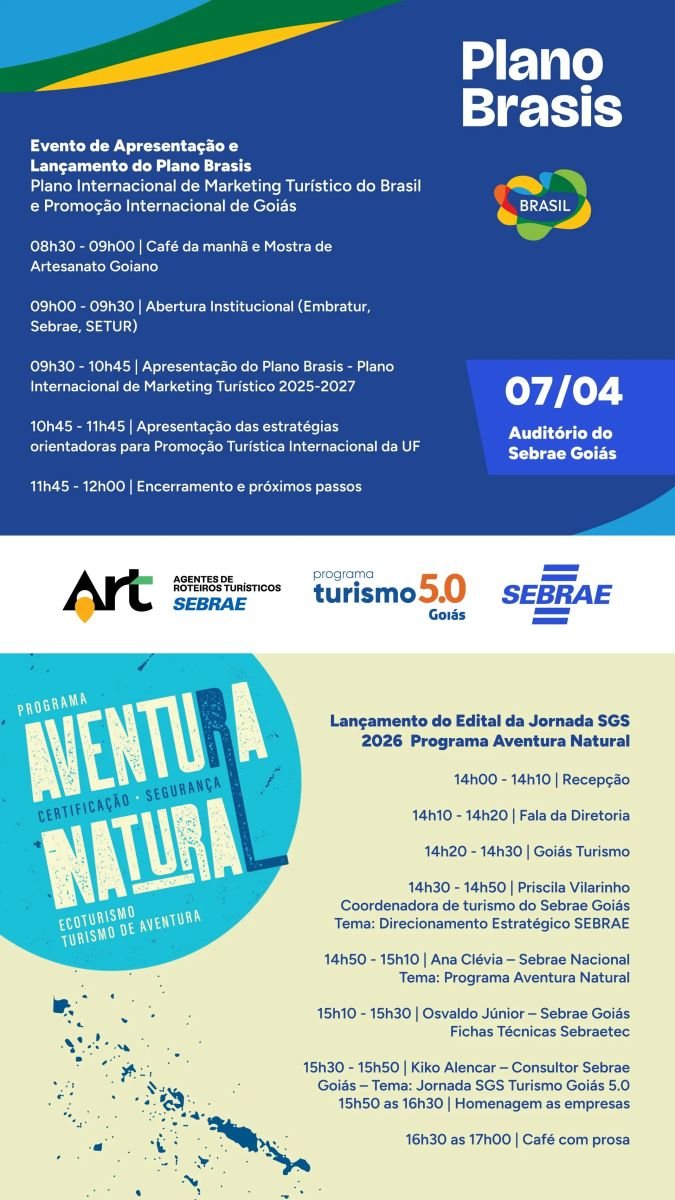 Goiás é reconhecido como destino turístico com uma profunda identidade territorial, oferecendo experiências superiores em aventura, cultura, natureza, gastronomia, bem-estar e religiosidade. Para potencializar ainda mais o setor e traçar estratégias conjuntas, o Sebrae Goiás vai apresentar, na manhã do dia 07/04, o Plano Internacional de Marketing Turístico do Brasil (Plano Brasis) e um documento para promoção de Goiás no exterior. E na parte da tarde será lançado o edital da Jornada SGS 2026 – Programa Aventura Natural, de preparação e certificação em segurança para operadores turísticos.