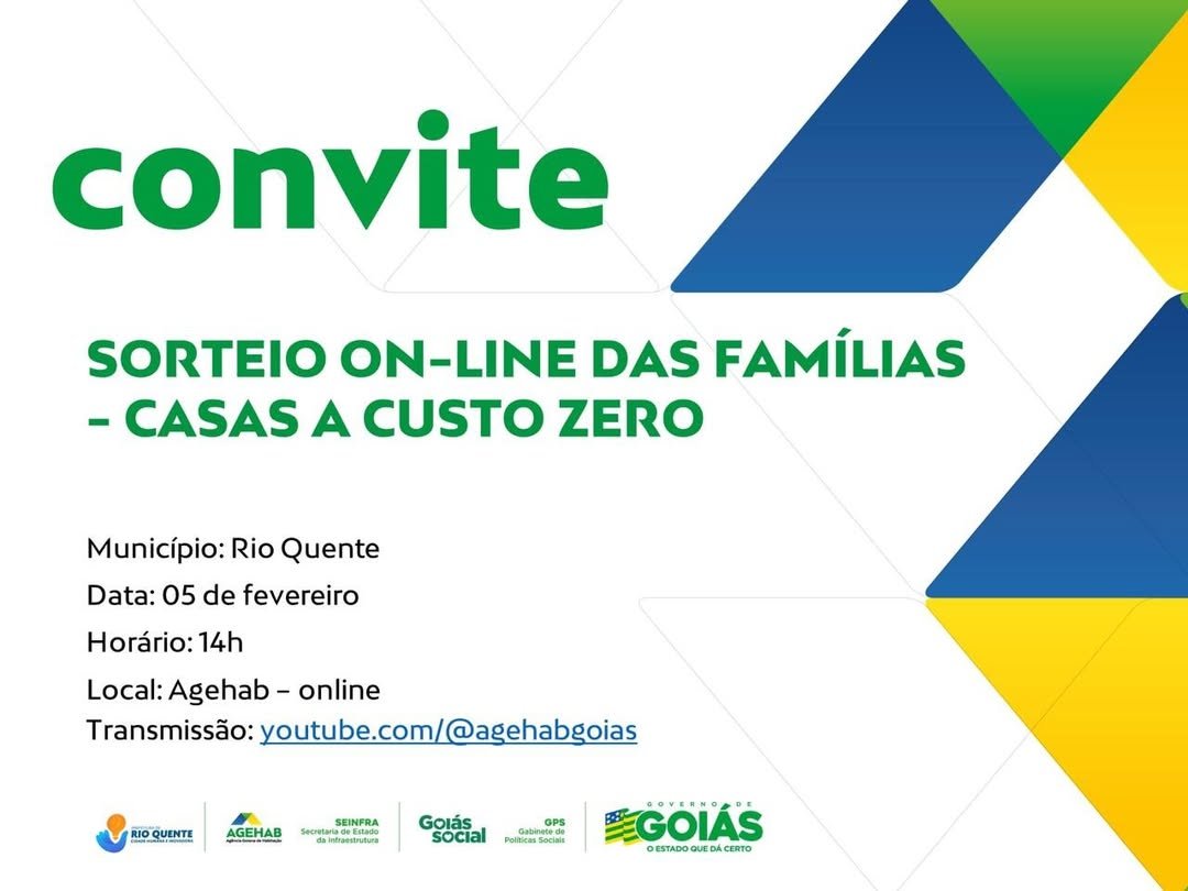 A transmissão do sorteio será realizada a partir das 14h pelo canal oficial da Agência Goiana de Habitação (Agehab) no YouTube (youtube.com/@agehabgoias), garantindo transparência ao processo de seleção.