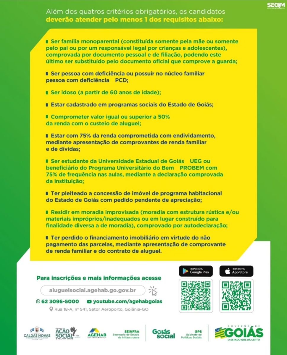 As inscrições devem ser realizadas exclusivamente pela internet, através do site [aluguelsocial.agehab.go.gov.br](http://aluguelsocial.agehab.go.gov.br) ou pelo aplicativo “Aluguel Social”, disponível para download por meio de QR Code. Dúvidas sobre o processo de inscrição ou informações adicionais podem ser esclarecidas diretamente na sede do CadÚnico em Caldas Novas.