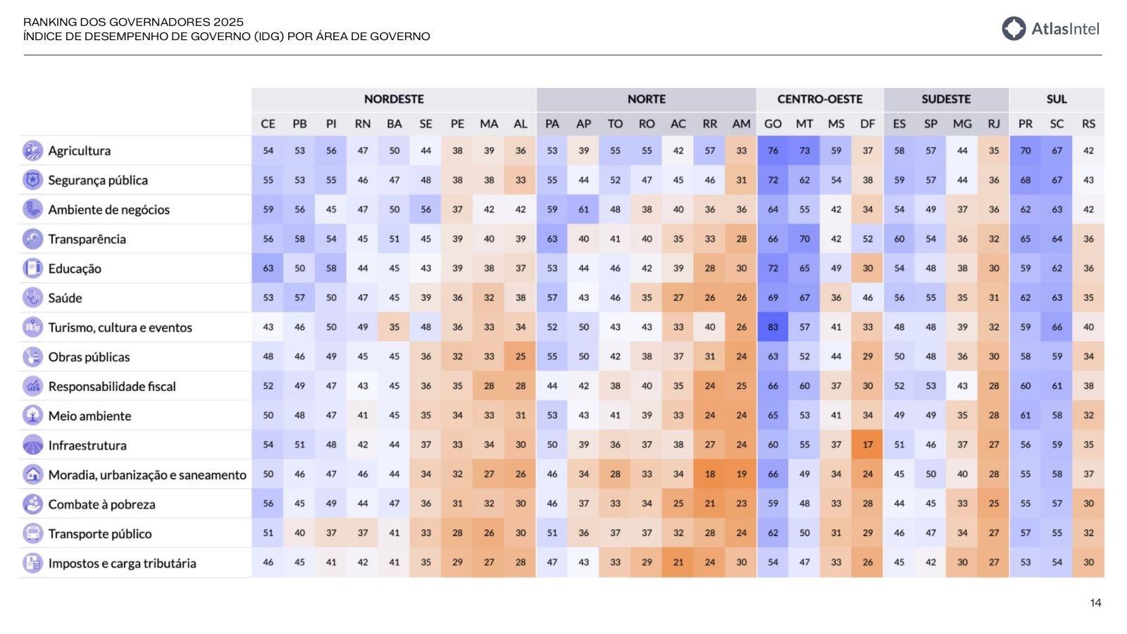 O índice foi construído a partir das entrevistas que o Atlas/Intel fez entre os dias 6 de outubro e 5 de dezembro de 2025, com 200.980 pessoas. Cada entrevistado teve que avaliar as áreas-chave em uma escala de cinco pontos, que varia de “péssimo” a “ótimo”. Cada ponto dessa escala atribui uma pontuação específica, permitindo a conversão da avaliação qualitativa em um indicador quantitativo.