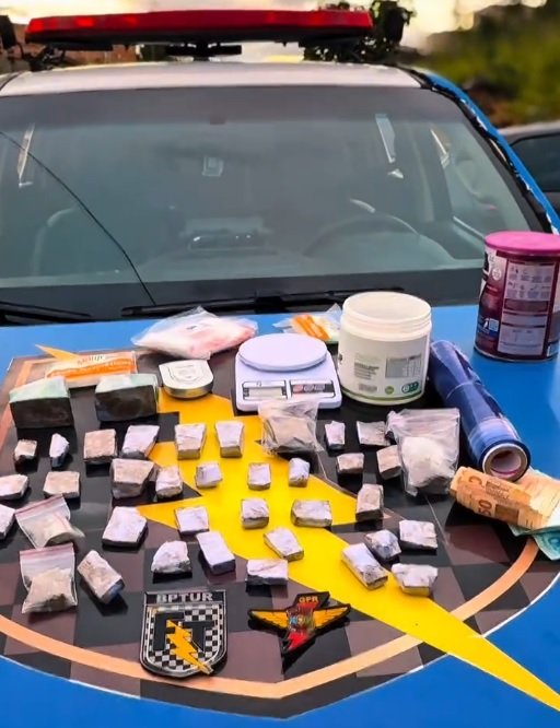 Durante patrulhamento nas imediações da Unidade Prisional do município, os militares avistaram um veículo VW Gol branco trafegando em alta velocidade, o que motivou a abordagem com apoio do Grupamento de Patrulhamento Rural (GPR). Na revista ao automóvel, foi localizada substância análoga à maconha, totalizando aproximadamente 52 gramas.