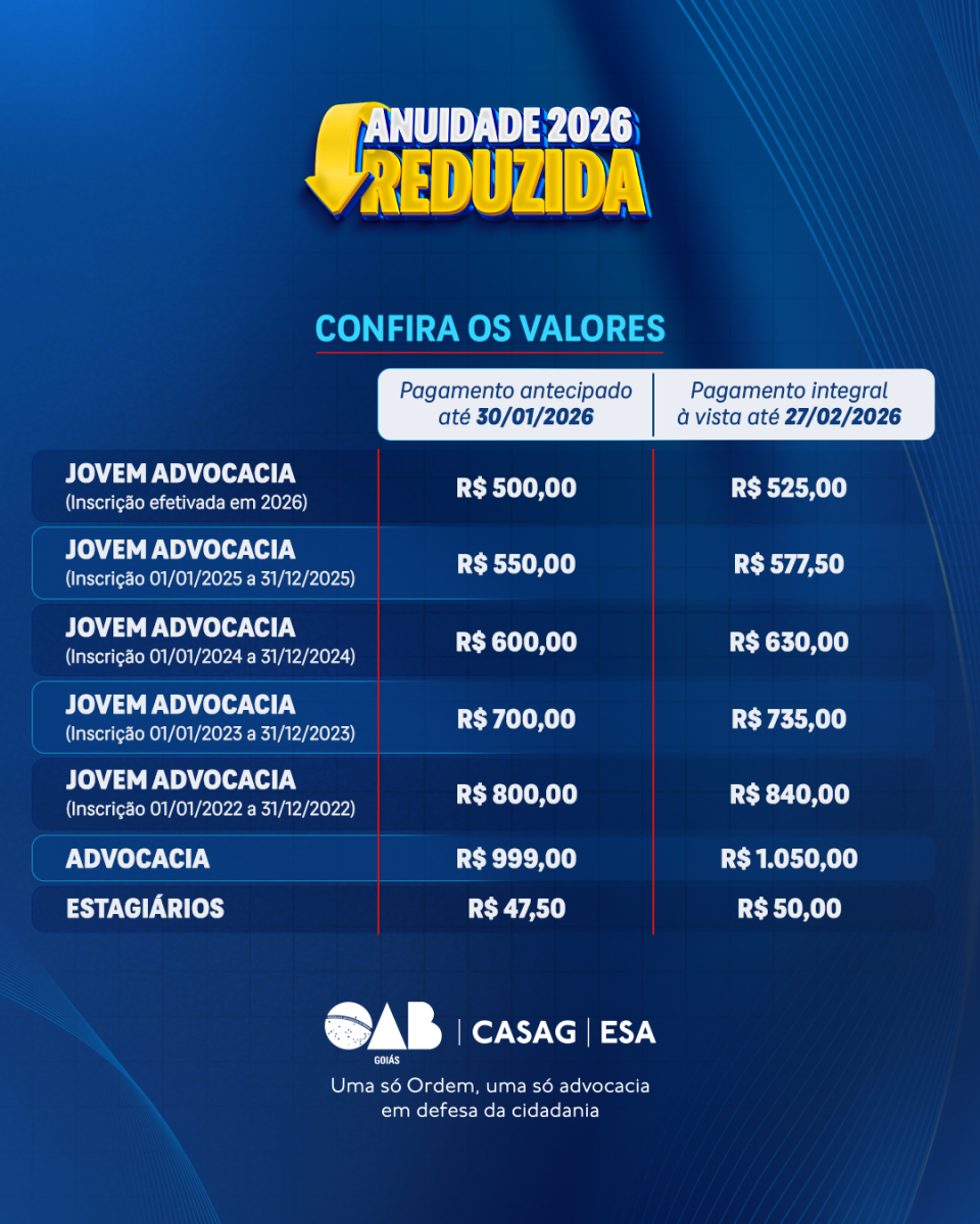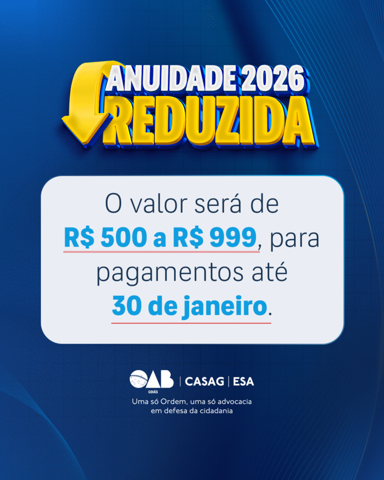 Os advogados e advogadas inscritos junto à Ordem dos Advogados do Brasil – Seção Goiás (OAB-GO) vão pagar uma anuidade de menos de mil reais em 2026. O Conselho Seccional aprovou, por unanimidade, a redução de até 11,46% para o próximo ano. O valor vigente, de R$ 1.128,24, passará para R$ 999, se pago até o dia 30 de janeiro. Para advogados em início de carreira, inscritos em 2026, o valor será de R$ 500. O desconto é reflexo do compromisso da instituição com a sustentabilidade financeira da advocacia goiana. (clique aqui e veja o passo a passo para acessar sua anuidade)