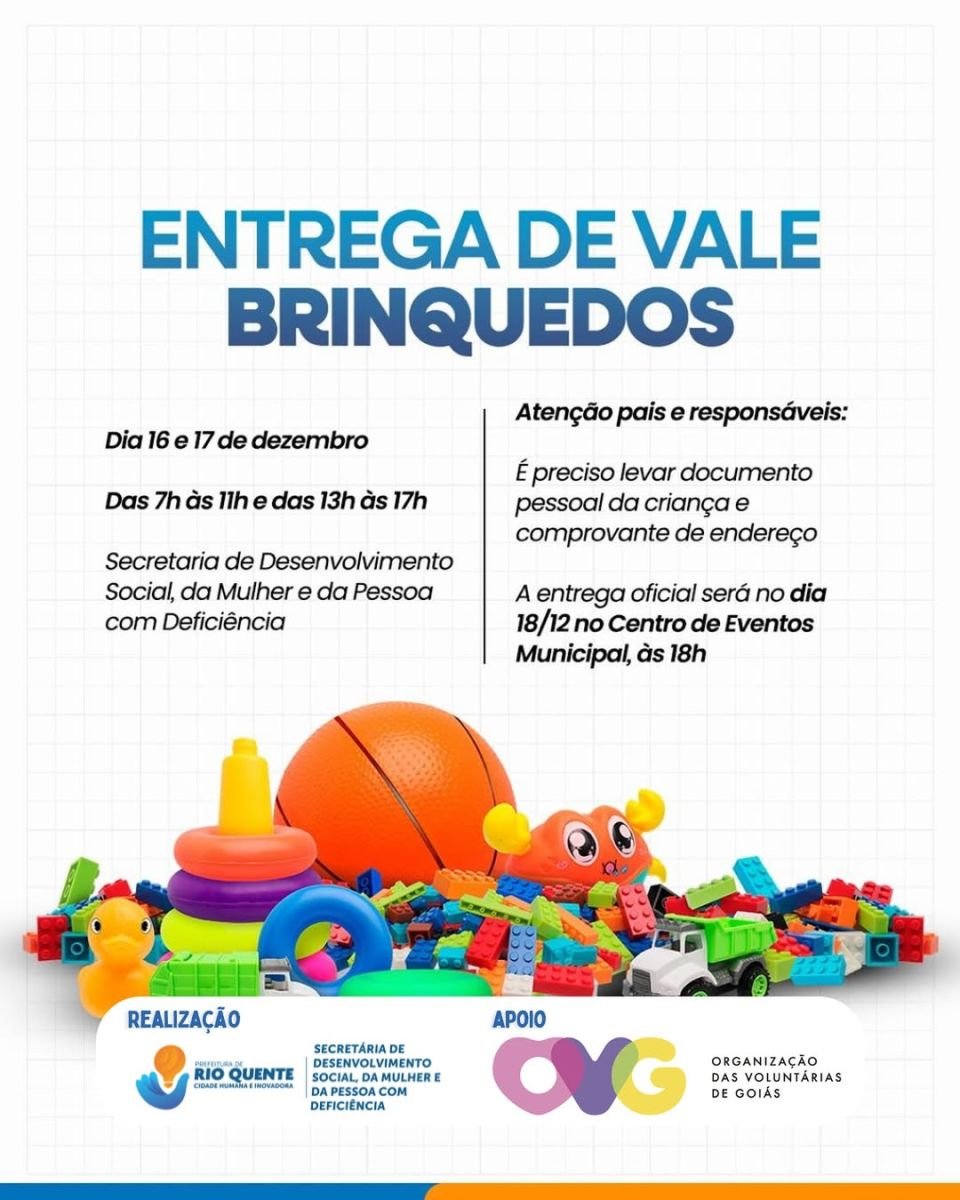 A magia do Natal ganha contornos ainda mais especiais para as crianças de Rio Quente com a tradicional campanha de distribuição de brinquedos promovida pela Prefeitura Municipal. A iniciativa, coordenada pela Secretaria de Desenvolvimento Social, da Mulher e da Pessoa com Deficiência, beneficiará famílias cadastradas com a entrega de presentes natalinos, contando com o apoio da Organização das Voluntárias de Goiás.