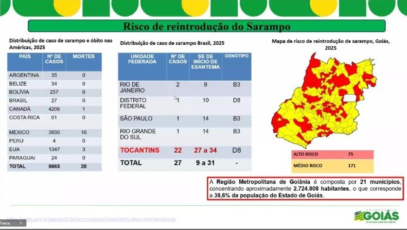 Segundo a superintendente de Vigilância Epidemiológica e Imunização da SES-GO, Cristina Laval, o Brasil já contabiliza 27 casos de sarampo; 22 deles no vizinho estado do Tocantins, considerado em surto ativo (Arte: SES-GO)